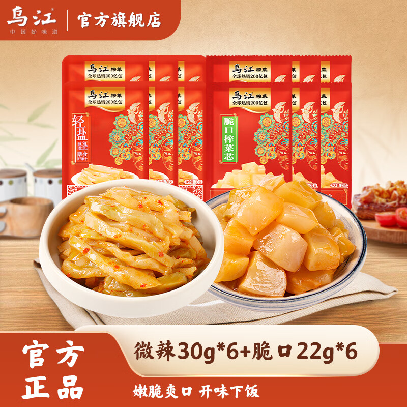 乌江22g脆口榨菜芯+30g榨菜丝组合 爽口开味下饭搭档学生榨菜拌面 微辣30g*6+脆口22g*6