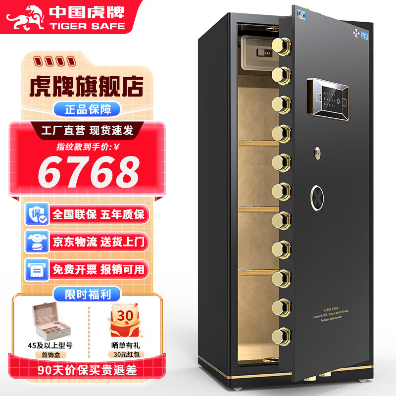 虎牌【CSP国标认证 CE欧盟认证】保险柜家用小型办公大型保险箱防火防盗全钢重型加厚防搬走可入墙 高1.8m单门 黑色 指纹款(指纹/密码/钥匙开启)