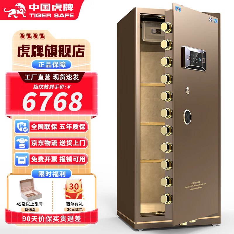 虎牌【CSP国标认证 CE欧盟认证】保险柜家用小型办公大型保险箱防火防盗全钢重型加厚防搬走可入墙 高1.8m单门 咖色 指纹款(指纹/密码/钥匙开启)