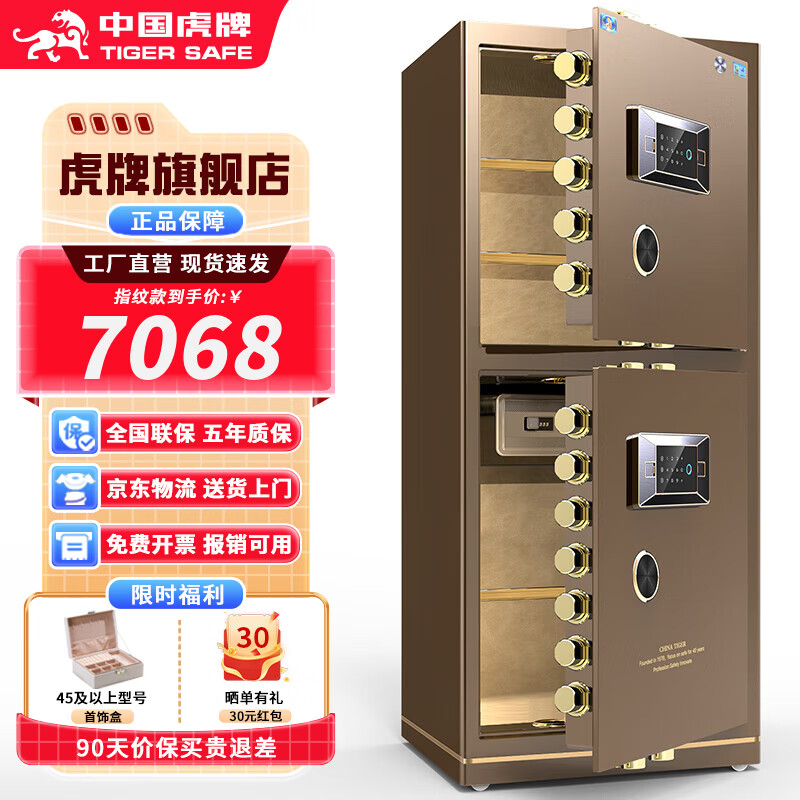 虎牌【CSP国标认证 CE欧盟认证】保险柜家用小型办公大型保险箱防火防盗全钢重型加厚防搬走可入墙 高1.8m双门 咖色 指纹款(指纹/密码/钥匙开启)