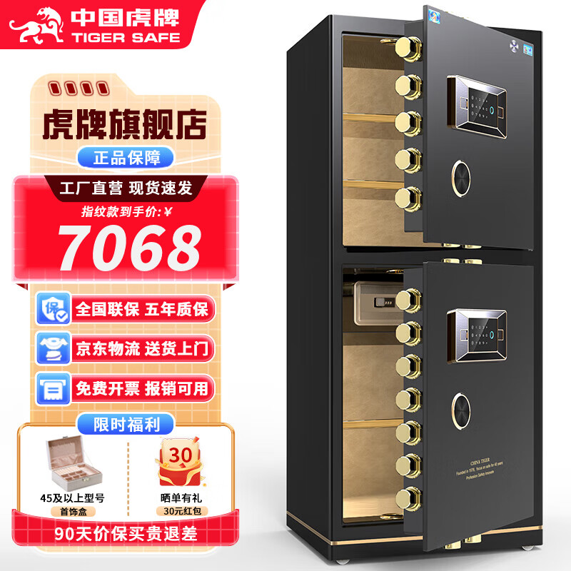 虎牌【CSP国标认证 CE欧盟认证】保险柜家用小型办公大型保险箱防火防盗全钢重型加厚防搬走可入墙 高1.8m双门黑色 指纹款(指纹/密码/钥匙开启)