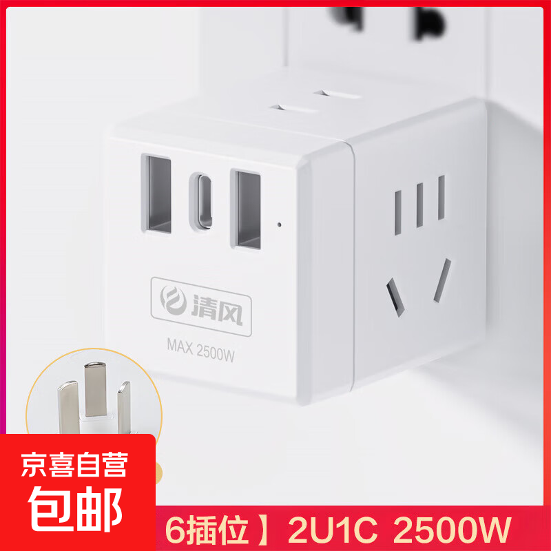 插座智能一转多魔方插座无线usb多功能插排家用宿舍大功率带线 无线 2U1C 3位 白色