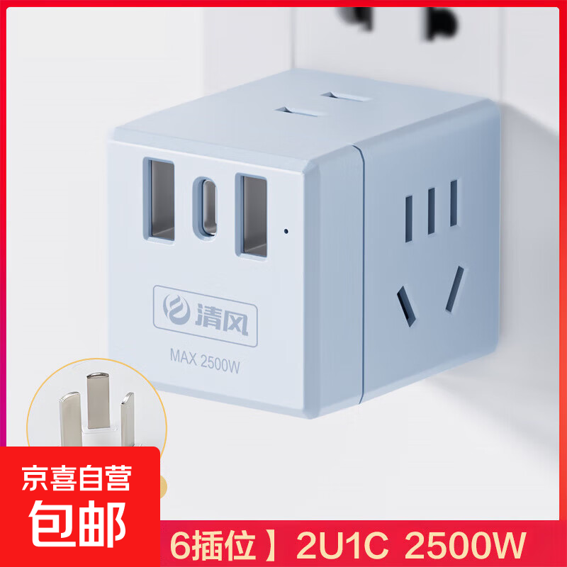 插座智能一转多魔方插座无线usb多功能插排家用宿舍大功率带线 无线 2U1C 3位 蓝色