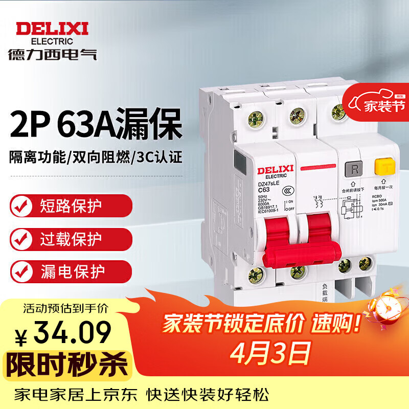 德力西电气空开断路器空气开关漏电保护开关DZ47sLE 2P 63A