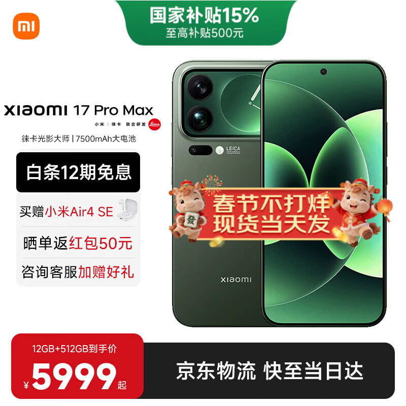 小米(MI)小米17promax 徕卡光影大师人像 第五代骁龙8至尊版 6.9英寸120Hz阳光屏 小米手机17promax 森野绿 12GB+512GB 【焕新补贴】