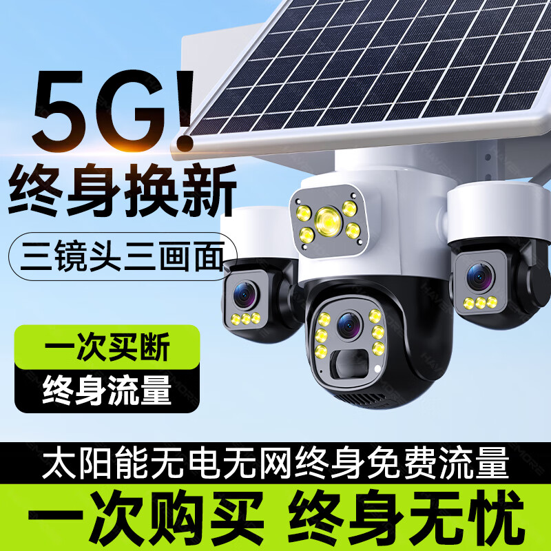 海威曼5G太阳能监控摄像头无电无网终身免流量高清20倍变焦三画面户外360度无死角带夜视全景全彩追踪 【太阳能5G标配】终身流量+10W单板
