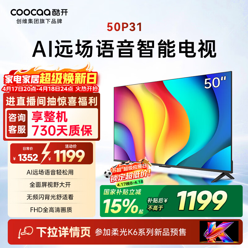 酷开创维电视 P31 50英寸 全高清超薄全面屏 节能护眼智慧屏 以旧换新国家补贴 液晶平板电视机 50P31