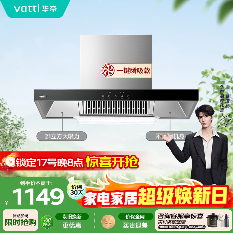 华帝【TOP烟机101】家用欧式顶吸抽油烟机【推荐搭配71B燃气灶具套装】21风量大吸力免清洗以旧换新