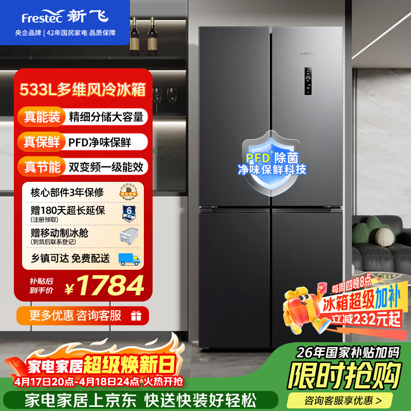 新飞533L十字门主动净味移动制冰舱一级风冷无霜大容量双变频电脑智控冰箱BCD-533WK8A国家补贴