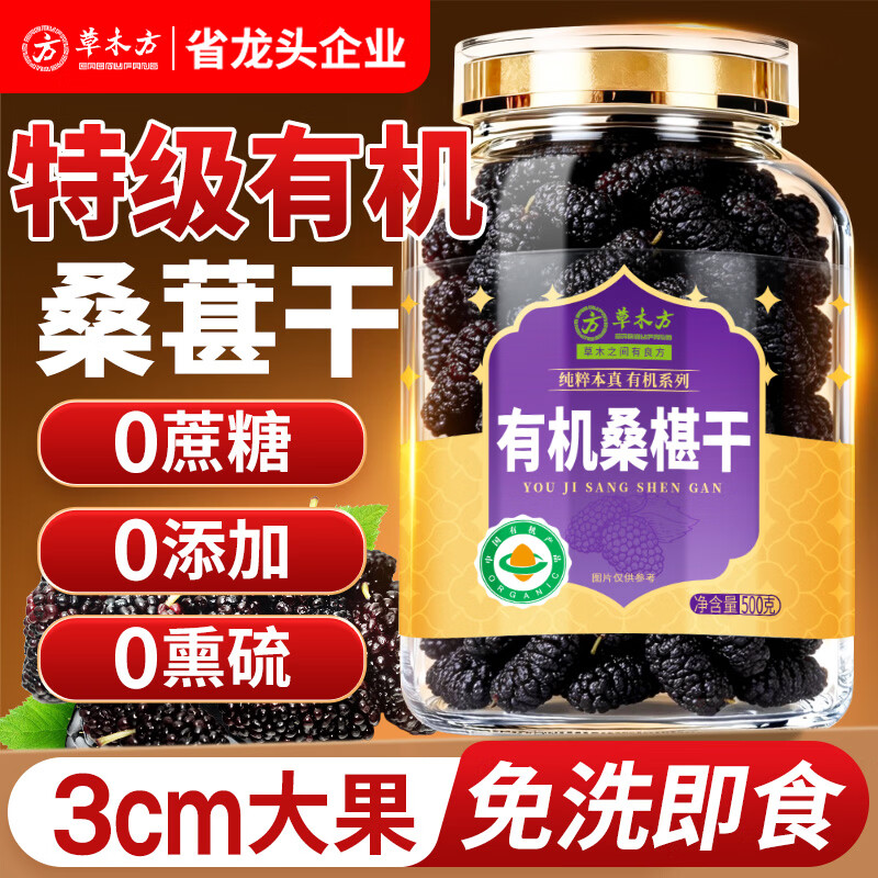 草木方 有机桑葚干500g 无沙桑葚干特级免洗即食黑桑椹无硫0添加养生茶