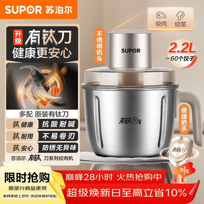 苏泊尔(SUPOR)绞肉机家用电动小型全自动多功能碎肉绞馅辅食料理机大容量搅拌机双钛刀不锈钢碗 JR78S-G220