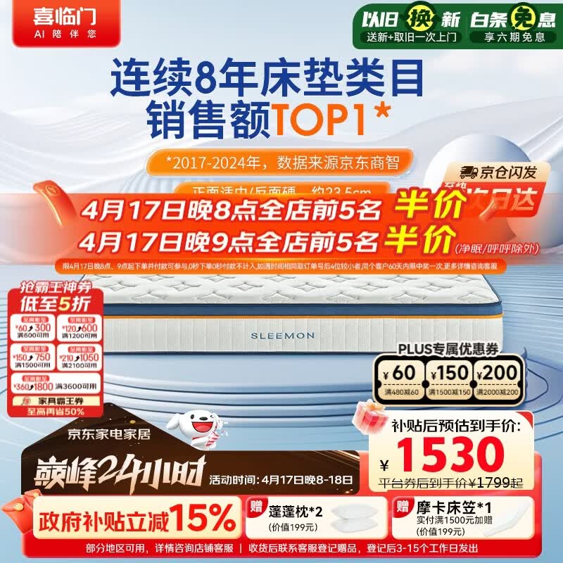 喜临门梦蝶床垫 乳胶椰棕床垫抗菌防螨独袋弹簧床垫1.5x1.9米软硬适中