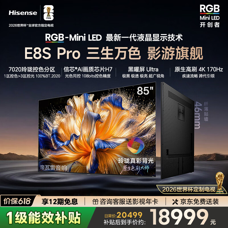 海信RGB-MiniLED电视 E8S Pro 85吋 玲珑真彩背光 H7芯片 黑曜屏Ultra 170Hz高刷 限时补贴 世界杯定制