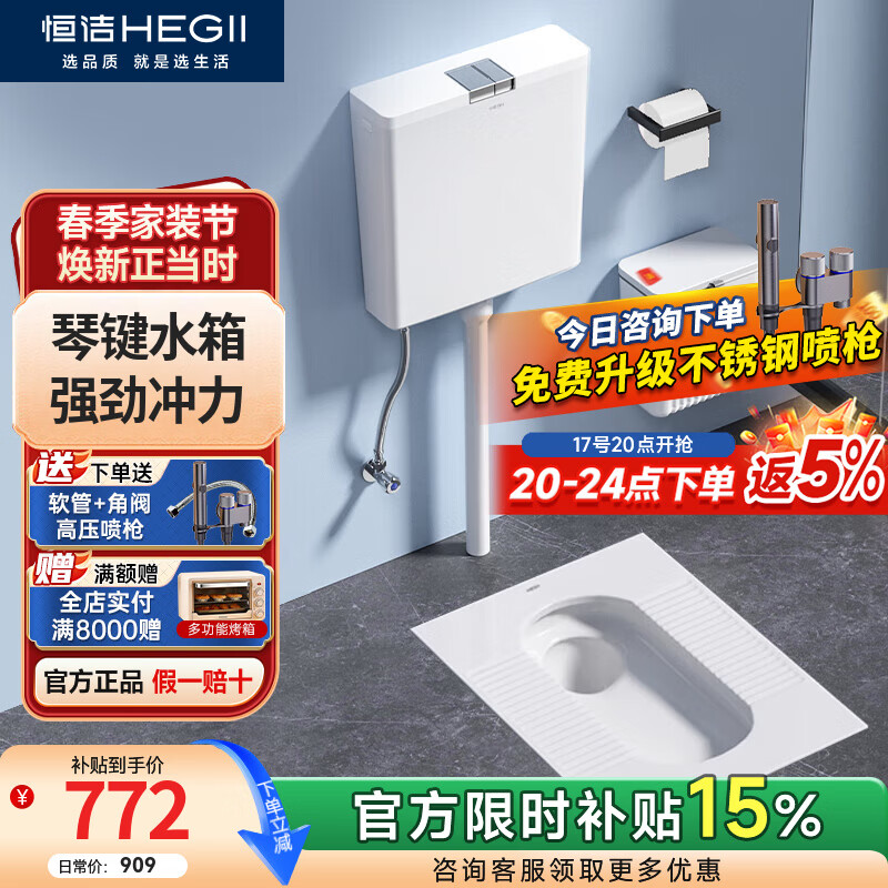 恒洁(HEGII)专利款蹲便器水箱套装超薄防溅防臭卫生间蹲便蹲坑蹲厕大便器3026 【专利款超薄防外溅】3032B+6050