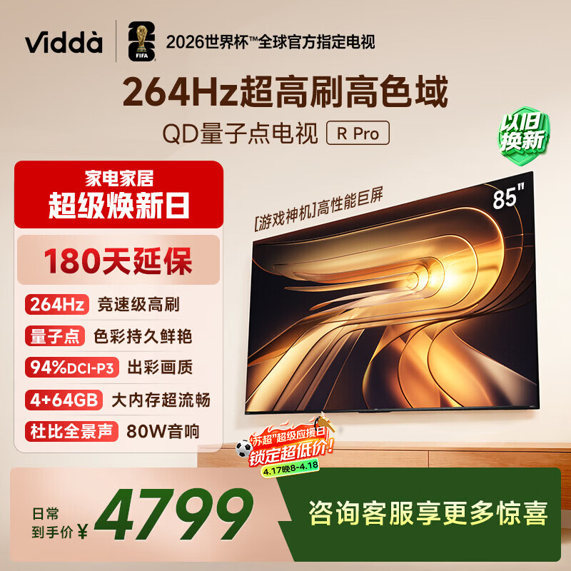 Vidda R Pro 85英寸 海信电视 264Hz高刷高色域 QD量子点 一级能效补贴液晶超薄电视机85VR1Q-PRO