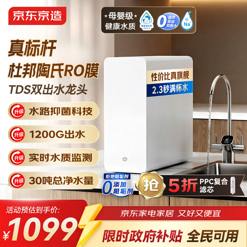 京东京造净水器灵犀1000G 0阻垢剂家用净水机 升级抑菌水路 Pro3.0杜邦陶氏RO反渗透母婴厨下净饮机