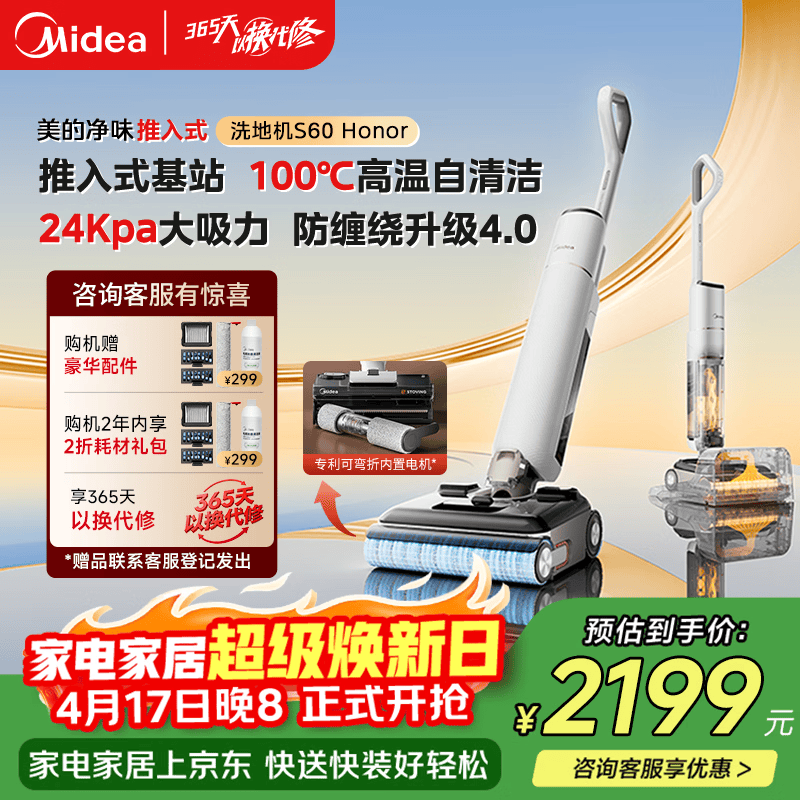 美的(Midea)推入式净味洗地机S60honor【2.5h快充 24Kpa大吸力 全向助力】洗拖吸一体全自动清洗拖地扫地机