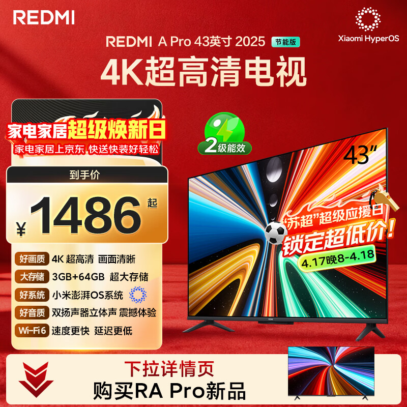 小米(MI)REDMI电视A Pro 43 2025节能版 43英寸 3GB+64GB 4K超高清电视机 L43RB-APE 二级能效家电