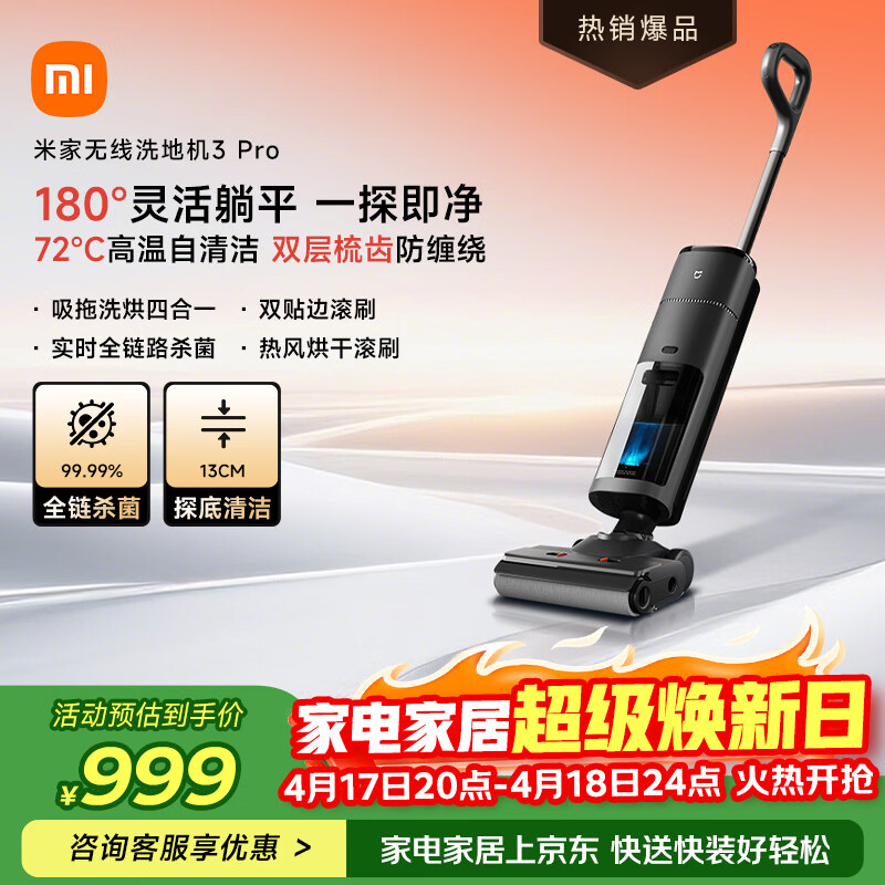 米家 【热销爆款】小米无线洗地机3Pro 扫地吸拖一体 180°躺平全链杀菌 高温洗烘自清洁 毛发防缠绕