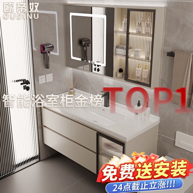欧帝奴(OUDINU)智能浴室柜 卫生间奶油风陶瓷一体盆洗手洗脸盆柜卫浴洗漱台 组合 智能玻璃镜柜-带配件 80cm