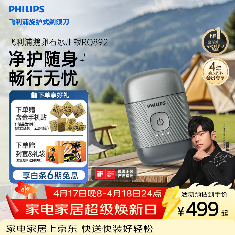 飞利浦电动剃须刀鹅卵石便携款剃须刀 0.0微米净剃黄金比例 冰川银 车载好物 生日礼物送男生老公父亲