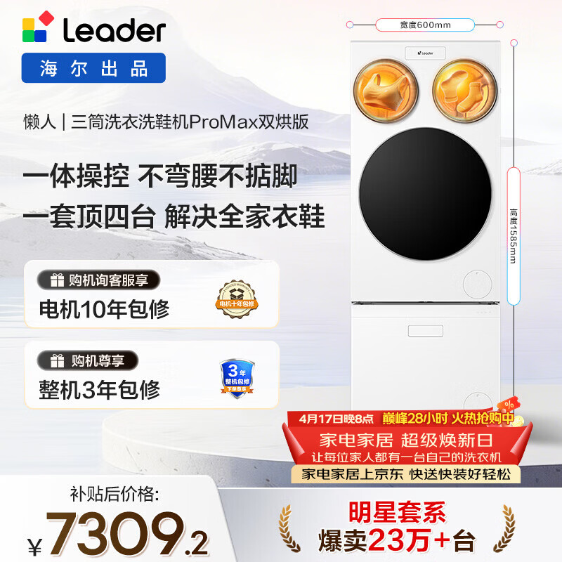 统帅(Leader)海尔出品懒人三筒洗衣洗鞋机套装ProMax双烘12.5KG一屏操控 家电补贴XQGL125-MHBLDE697U1+TB696
