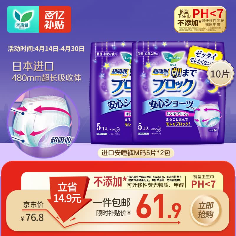乐而雅花王进口安睡裤型卫生巾M码 5片*2包共10片姨妈巾超长京东自营