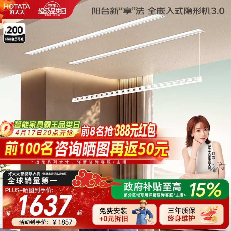好太太隐形晾衣架电动晾衣机隐藏式自动智能升降阳台嵌入式晒衣架 【超宽间距 衣被同晒】D-3200