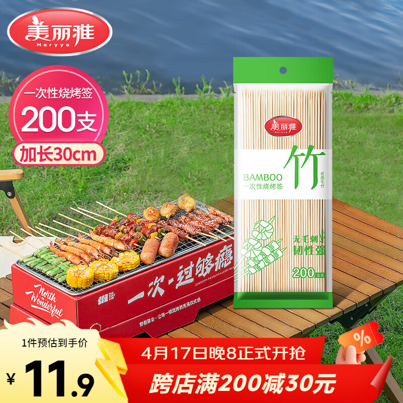 美丽雅烧烤签子200支 一次性加长30cm烤串钵钵鸡羊肉串冰糖葫芦竹签