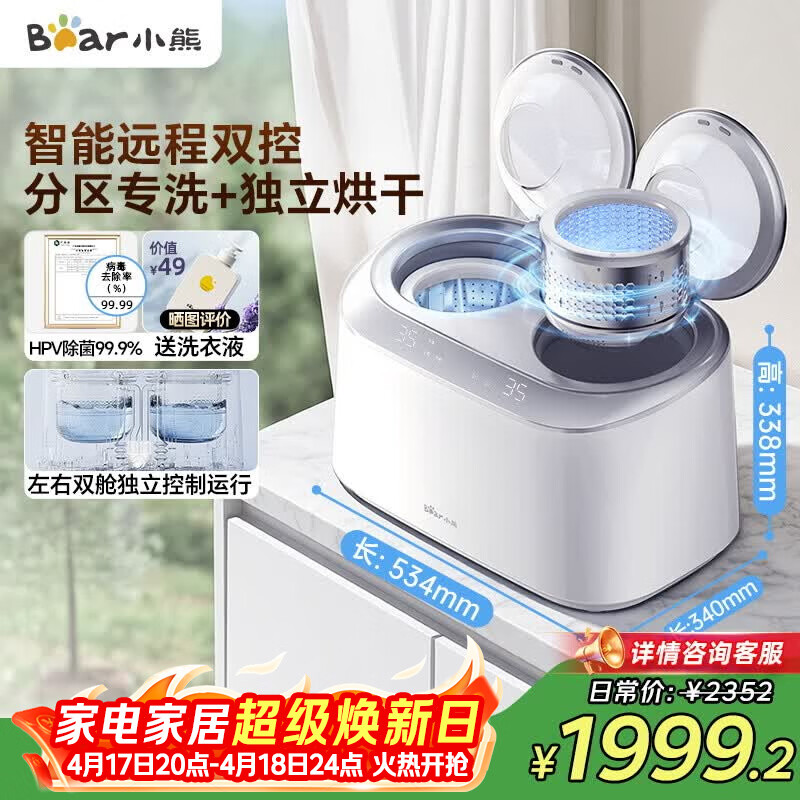 小熊(Bear)双桶内衣洗衣机波轮0.5KG全自动袜子内裤二合一专用双分区迷你洗XYJ-E04M6 以旧换新