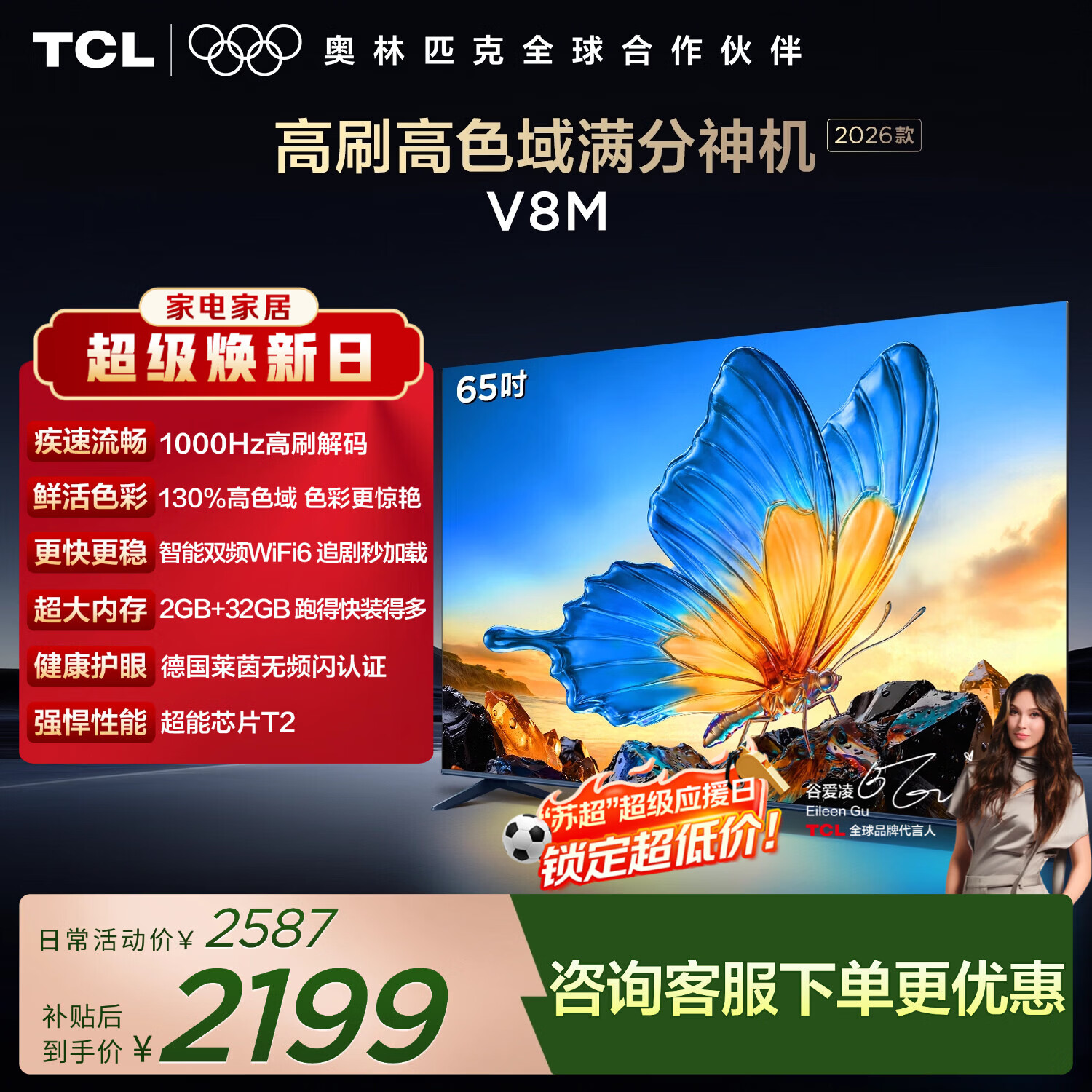 TCL电视【2026款】65V8M 65英寸 1000Hz高刷 万元级高色域 MEMC防抖 WiFi6 能效补贴 护眼电视