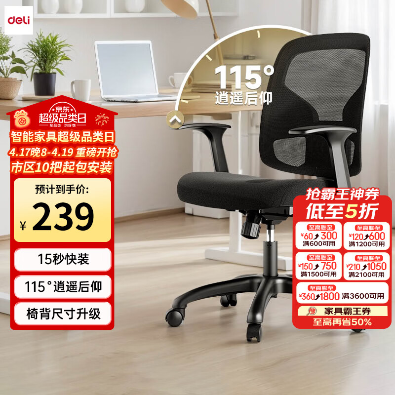 得力(deli)4900SP人体工学靠背电脑椅 舒适后仰办公椅 可升降舒棉坐垫 黑