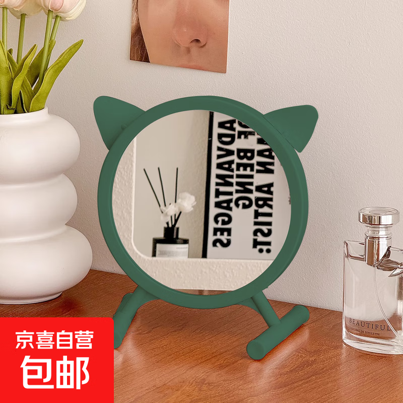 可爱卡通猫耳化妆镜家用小型学生宿舍桌面台式镜子办公室美妆镜 墨玉绿 20*23cm
