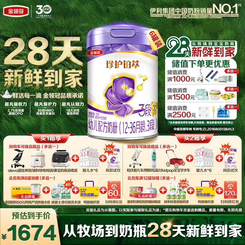 伊利金领冠珍护铂萃3段(12-36月)750g*6罐 超凡乳源HMOs 28天新鲜到家