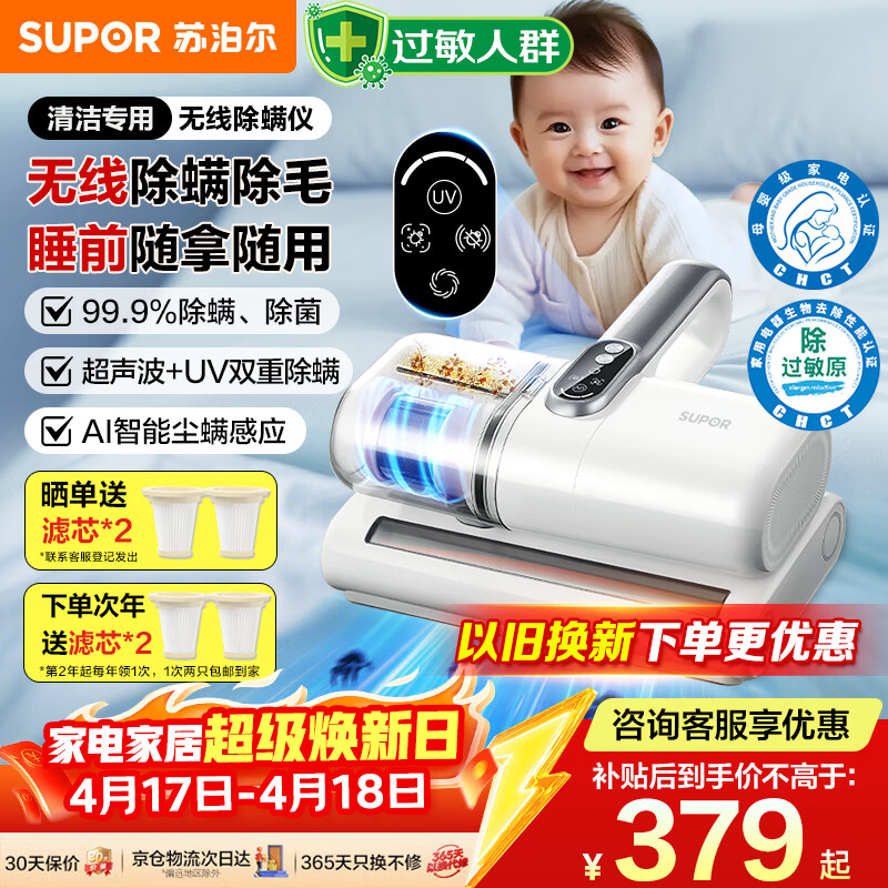 苏泊尔(SUPOR)除螨仪无线【母婴级】18kpa大吸力家用床宝除过敏原认证紫外线杀菌超声波驱螨除螨吸尘ER-TT8X