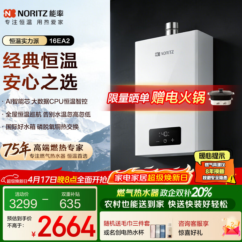 能率(NORITZ)【小云朵EA2】16升燃气热水器天然气 AI智慧芯 恒温巡航 降噪下置风机 上门安装16EA2FEX