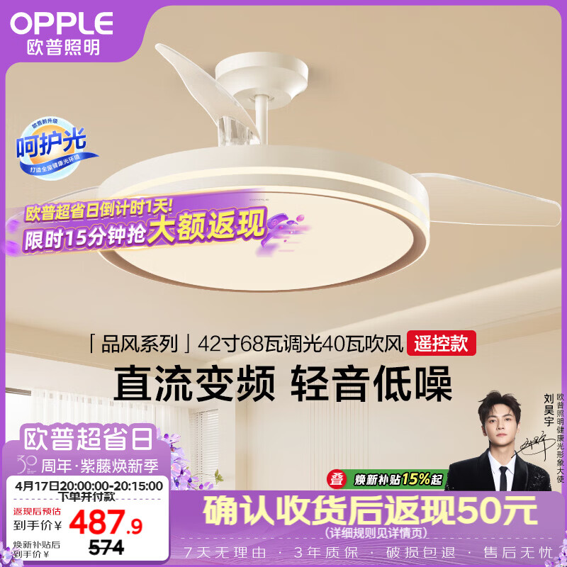 欧普照明(OPPLE)风扇灯吊扇灯遥控一体LED照明Ra95餐厅厨房卧室灯吊扇灯品风68瓦