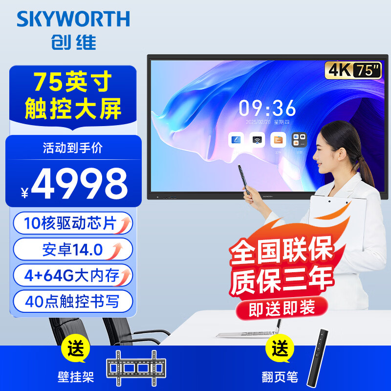 创维(Skyworth)75英寸会议平板一体机电子白板教学一体机触控显示大屏MT7511+壁挂架