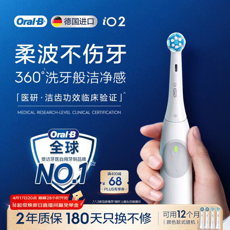 欧乐B德国进口智能电动牙刷成人iO2典雅白刷头*4柔波双净刷 情侣送礼生日礼物送男友送女友送长辈送父母