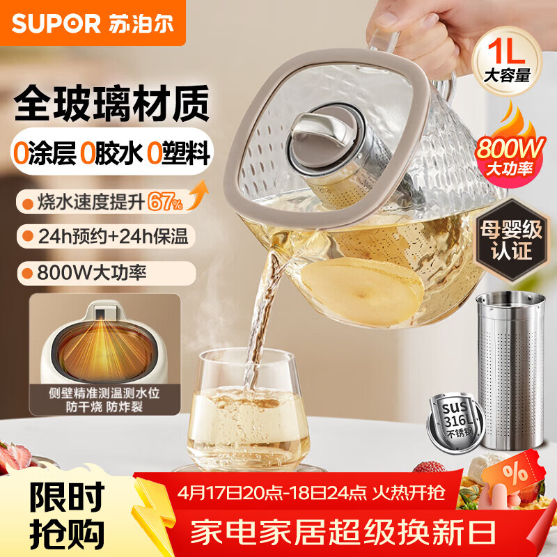 苏泊尔(SUPOR)全玻璃养生壶煮茶壶1L迷你养生杯煮茶器花茶壶 恒温壶母婴级 保温烧水壶316L带滤网0胶水SW-10Y08Q
