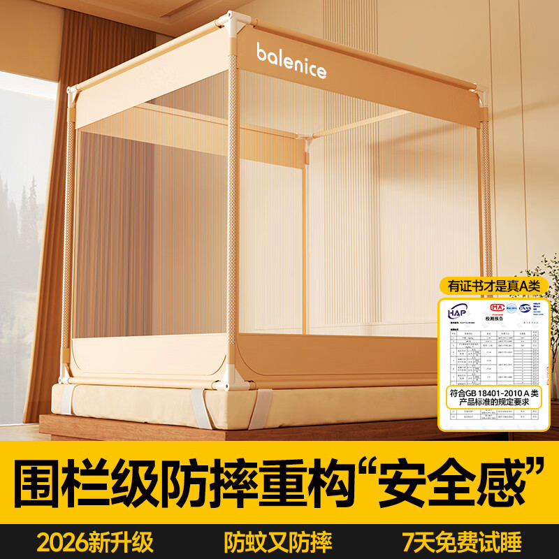 梦多福母婴儿防摔蚊帐架1.8×2米A类家用免安装蒙古包蚊帐方顶全底卧室 适用1.5×2.0m床丨全底加倍防摔 真A类丨全底更安全