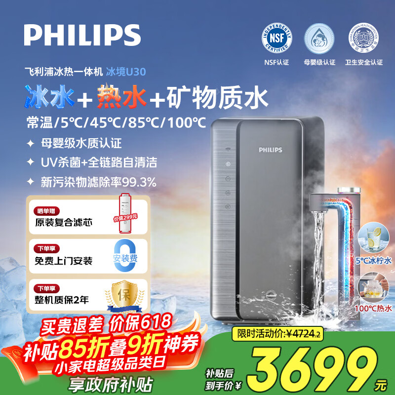 飞利浦(PHILIPS)加热净水器家用 冰境U30 5℃-100℃矿物质水1000G加热直饮厨房专用台下用冰热一体净水机AUT9021