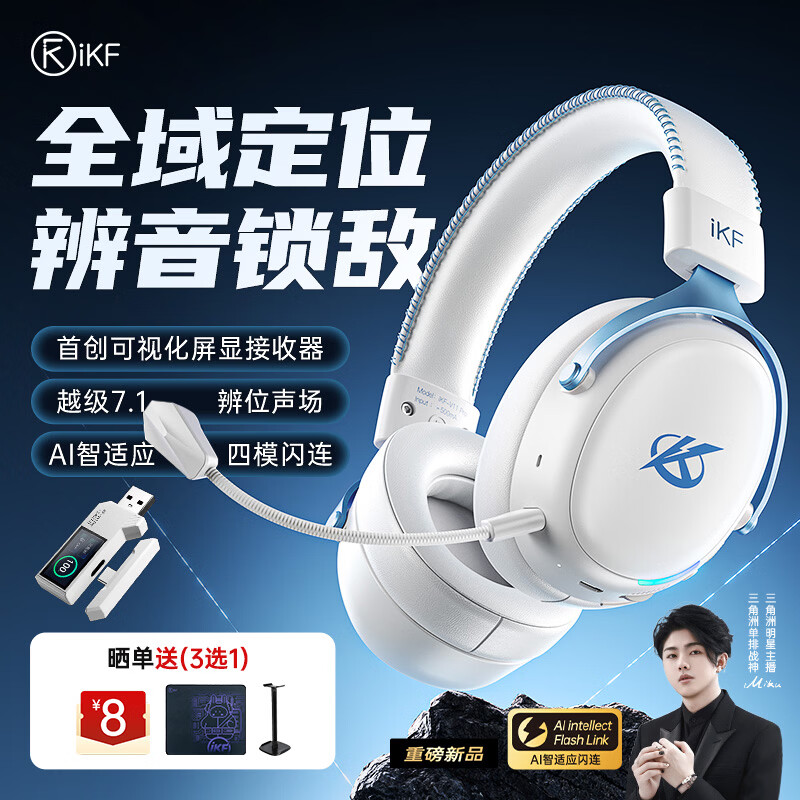 iKF V11 Pro2.0四模游戏耳机头戴式无线电竞屏显2.4G蓝牙FPS专用7.1声场三角洲驱动听声辨位 白蓝色