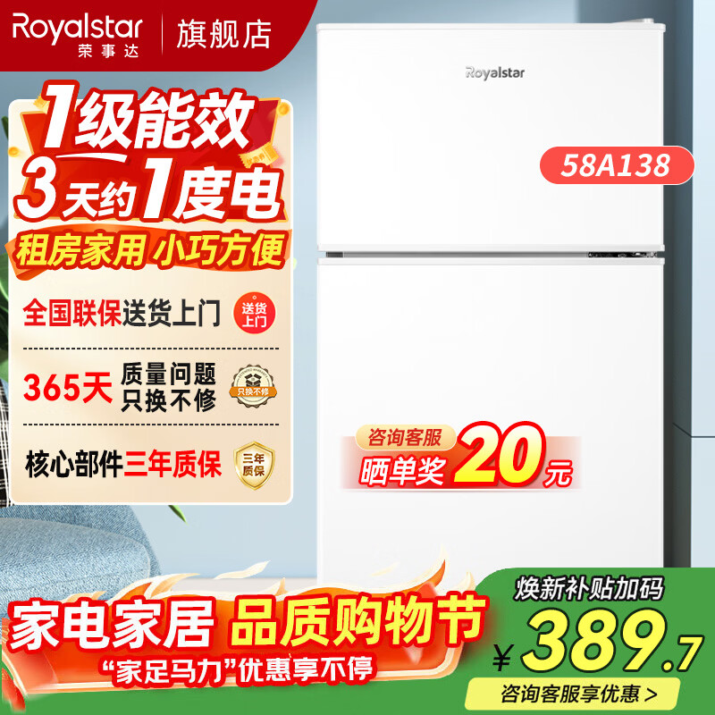 荣事达(Royalstar)小冰箱小型家用出租房双门一级能效宿舍冷藏冷冻两用节能电冰箱 58A138【一级能效】【三天不到1度电】白