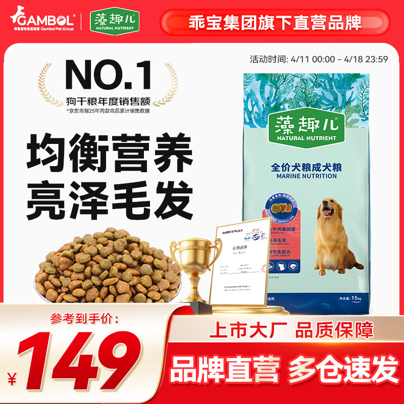 藻趣儿 狗粮 通用全价犬粮小中大型犬泰迪柯基金毛拉布拉多 成犬粮 15kg