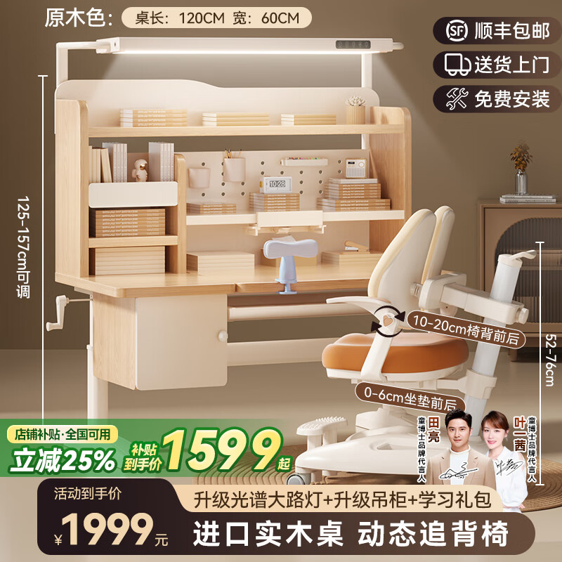 童博士儿童学习桌椅套装实木可升降写字桌小学生书桌课桌椅子阳光桌C12 1.2米实木桌+光谱大路灯+侧柜+追背椅橘 赠学习大礼包
