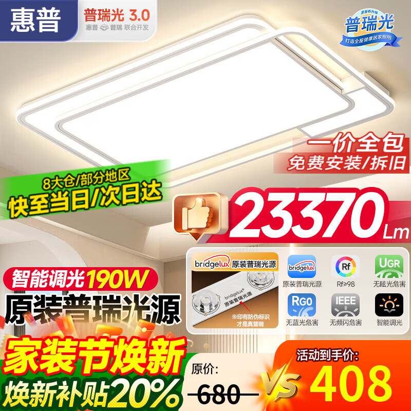 惠普客厅灯现代简约主灯普瑞护眼智能吸顶灯中山灯具新款全屋灯具套餐 190W 35㎡内适用 -110*70CM-智控