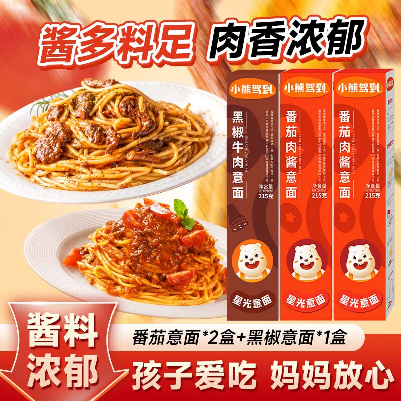 小熊驾到番茄肉酱意面 儿童速食意大利面面条方便面速食意粉通心粉 (番茄肉酱2盒+黑椒牛肉1盒) 215g*3盒