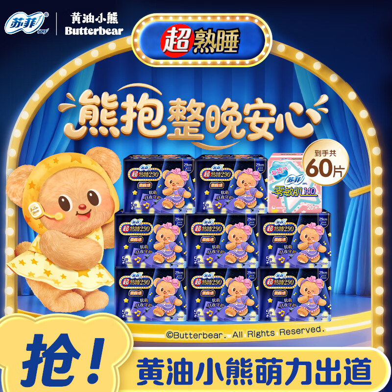 苏菲【黄油小熊联名】卫生巾夜用超熟睡420柔棉感量大姨妈巾旗舰店 夜用组合140+ 290mm 60片