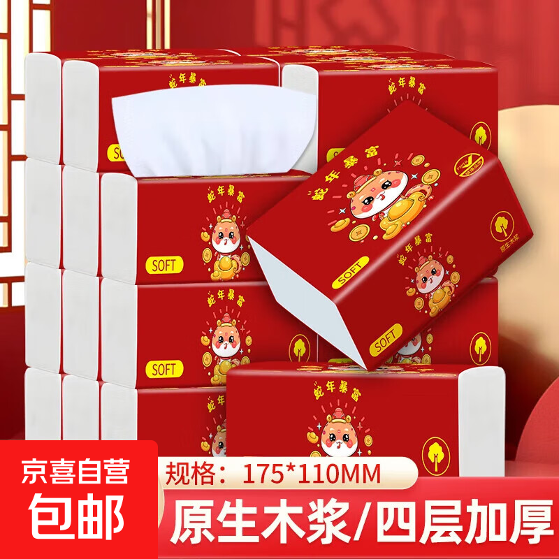 【京东物流】抽纸餐巾纸卫生纸4层加厚生活春节节庆多用面巾纸抽 蛇年暴富纸抽5包装-300抽
